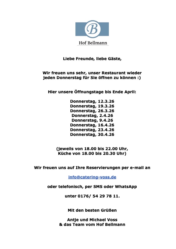 Restaurantbetrieb: zur Zeit jeden Donnerstag (außer an Feiertagen) ab 18:00 Uhr (Küche bis 20:30 Uhr).