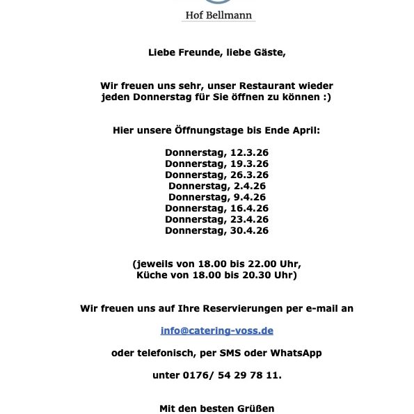 Tischreservierungen können Sie telefonisch unter 0176 / 54 29 78 11, per E-Mail an info@catering-voss.de oder über unser Kontaktformular vornehmen.